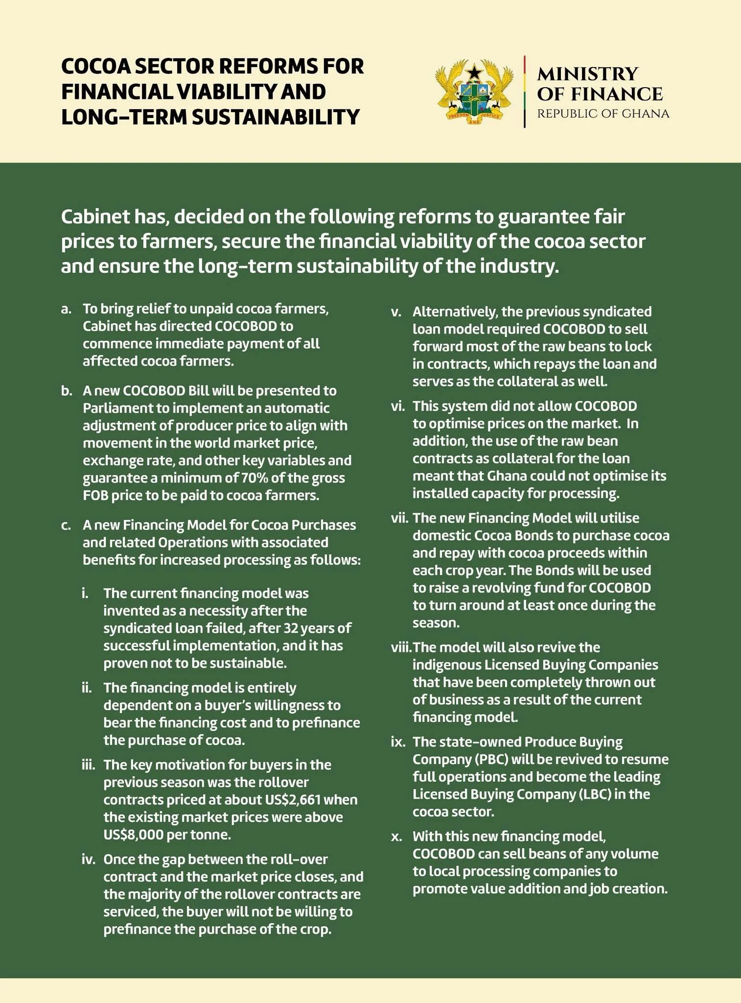 The announcement comes amid broader cocoa sector reforms aimed at improving financial viability and long-term sustainability, including changes to financing models and measures designed to guarantee fair returns to producers.