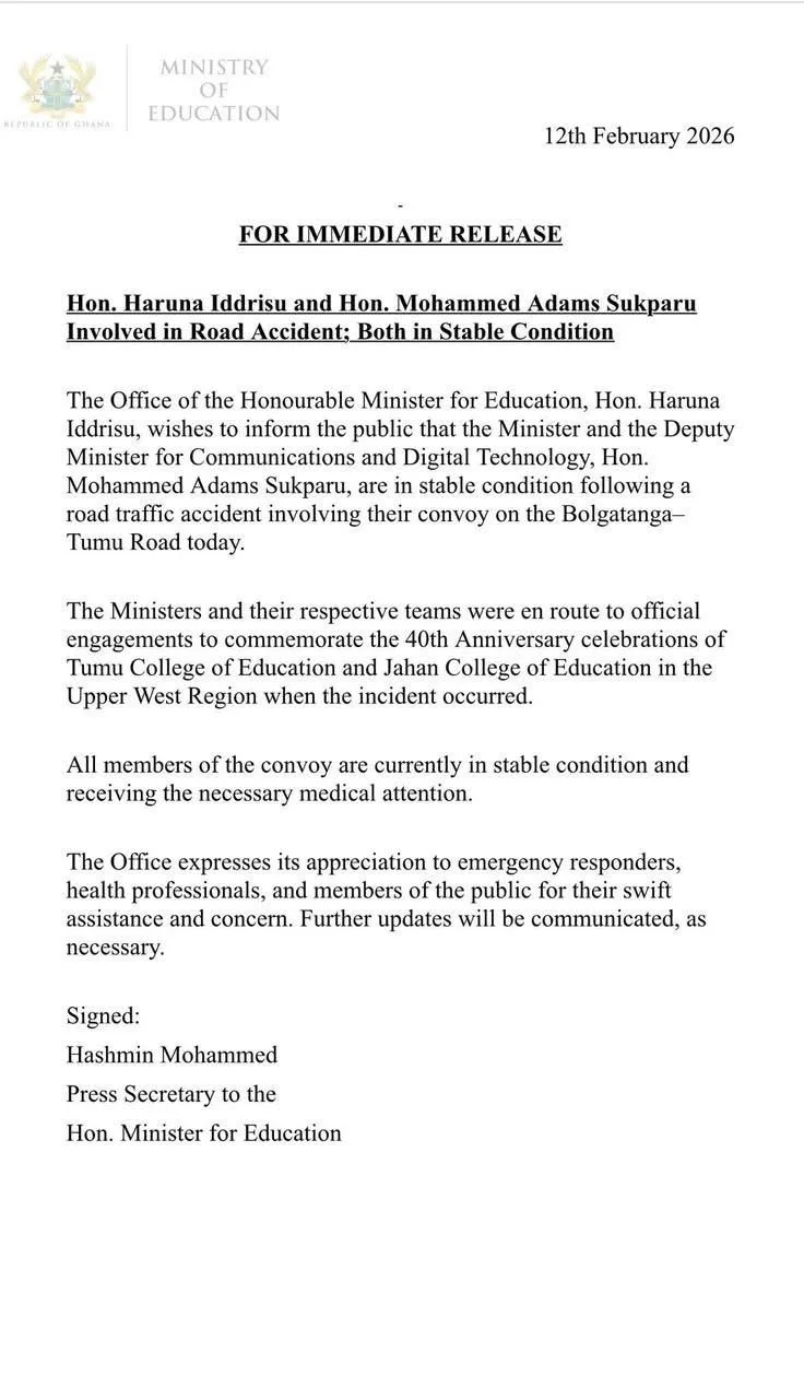 The statement indicated that, earlier that day, the ministers and their respective teams were en route to official engagements marking the 40th anniversary celebrations of Tumu College of Education and Jahan College of Education in the Upper West Region when the accident occurred.
